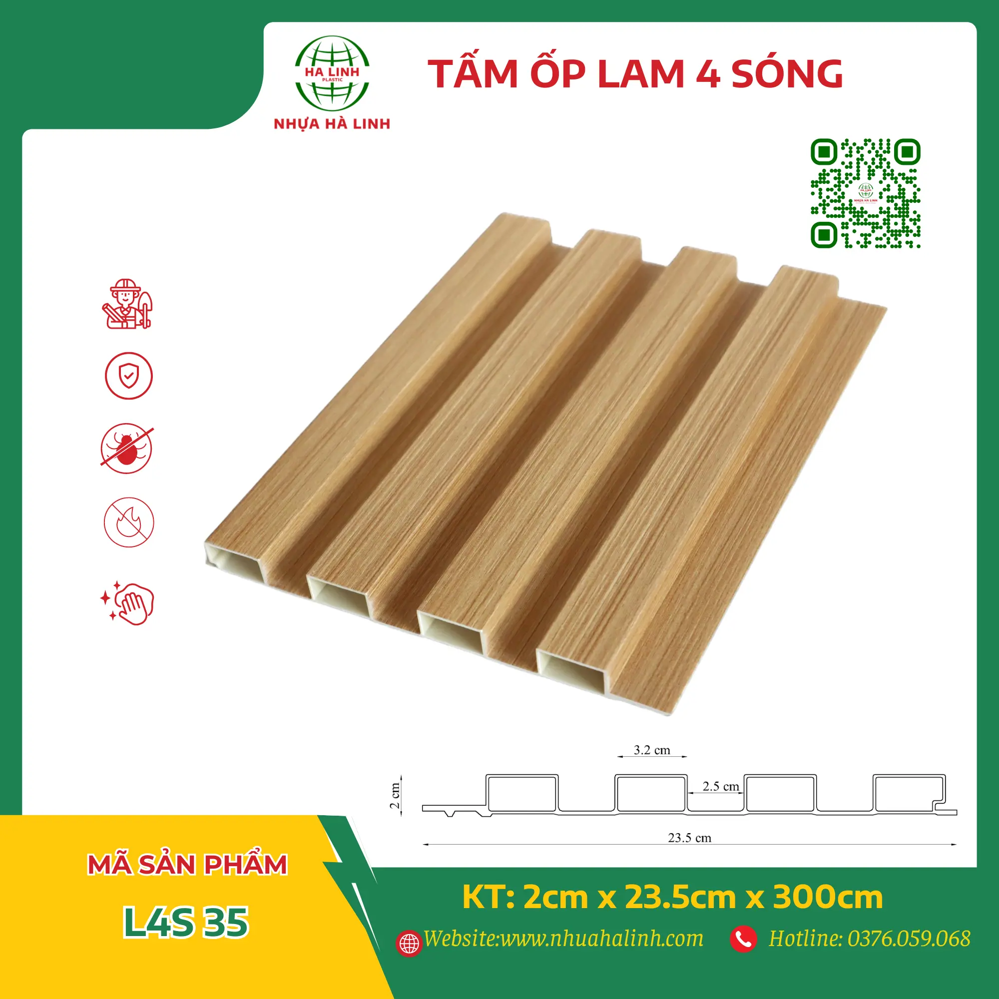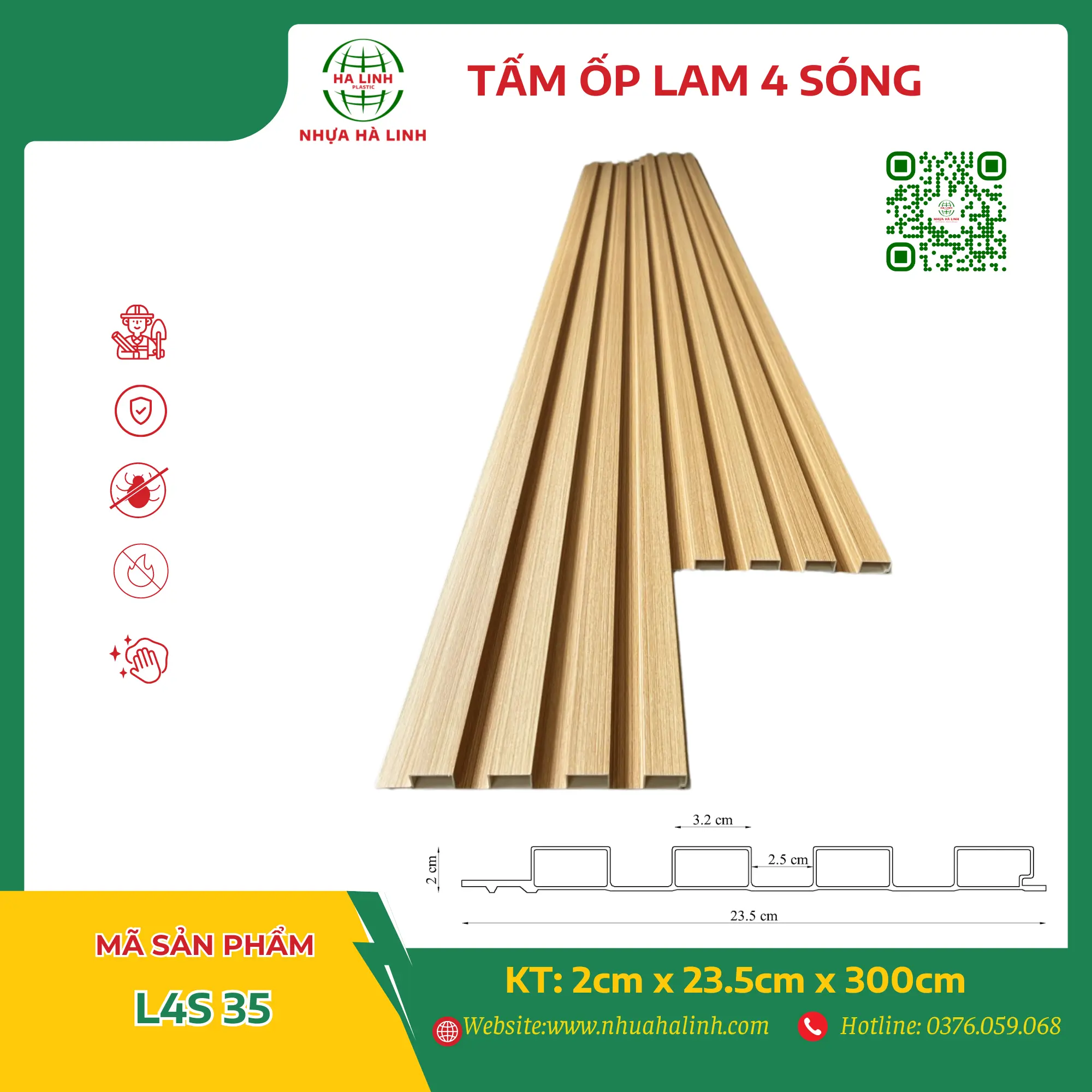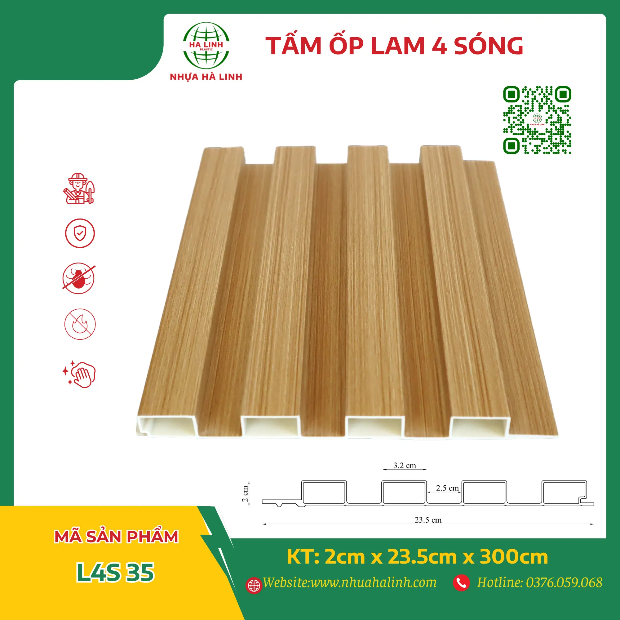 Để hiểu rõ hơn về từng sản phẩm tấm ốp trần tường của Công ty TNHH Sản Xuất Và Thương Mại Nhựa Hà Linh và đặc biệt là sản phẩm tấm ốp lam 4 sóng – L4S 35. Quý khách hàng xin vui lòng liên hệ với Nhựa Hà Linh qua: