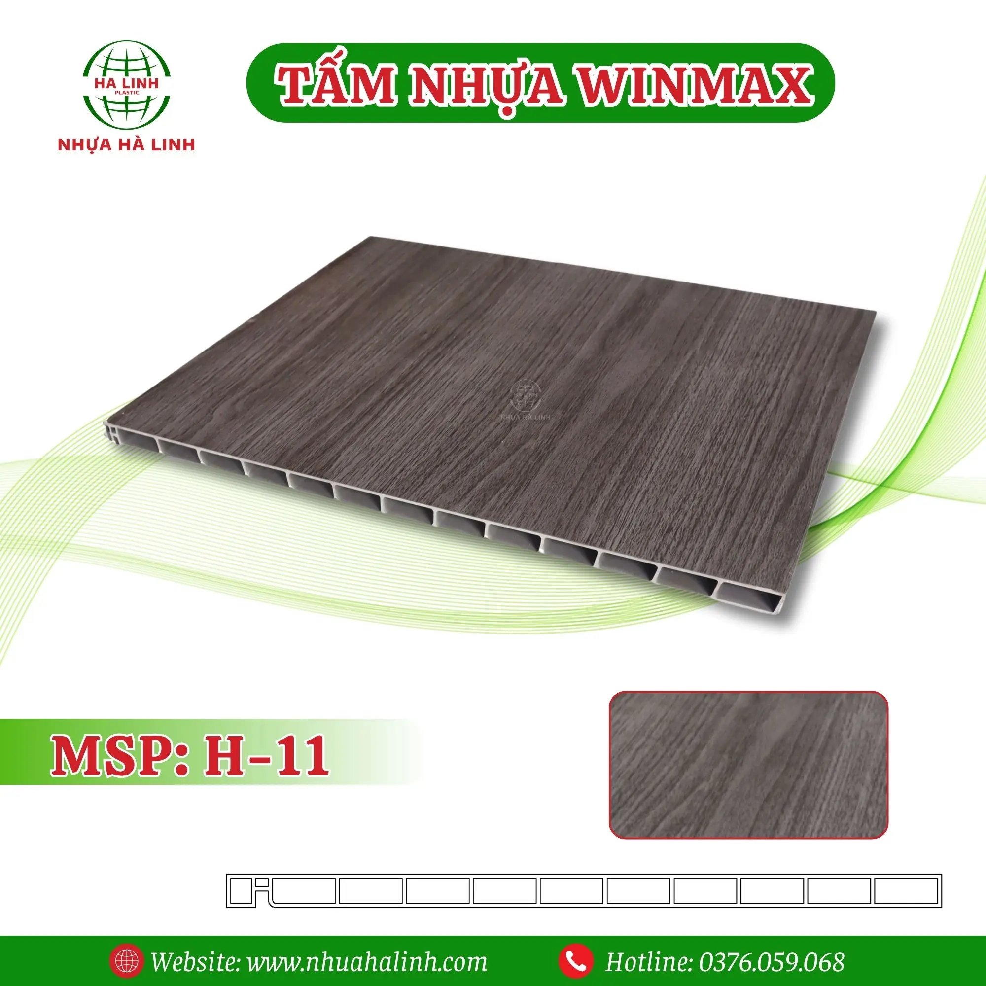 Tấm nhựa Winmax H-11 là sản phẩm cao cấp thuộc dòng Winmax của Nhựa Hà Linh, được sản xuất từ nhựa PVC nguyên sinh kết hợp công nghệ ép định hình hiện đại. Sản phẩm mang bề mặt vân gỗ sẫm màu, mô phỏng tinh tế vân gỗ tự nhiên, tạo cảm giác ấm áp và sang trọng cho mọi không gian.