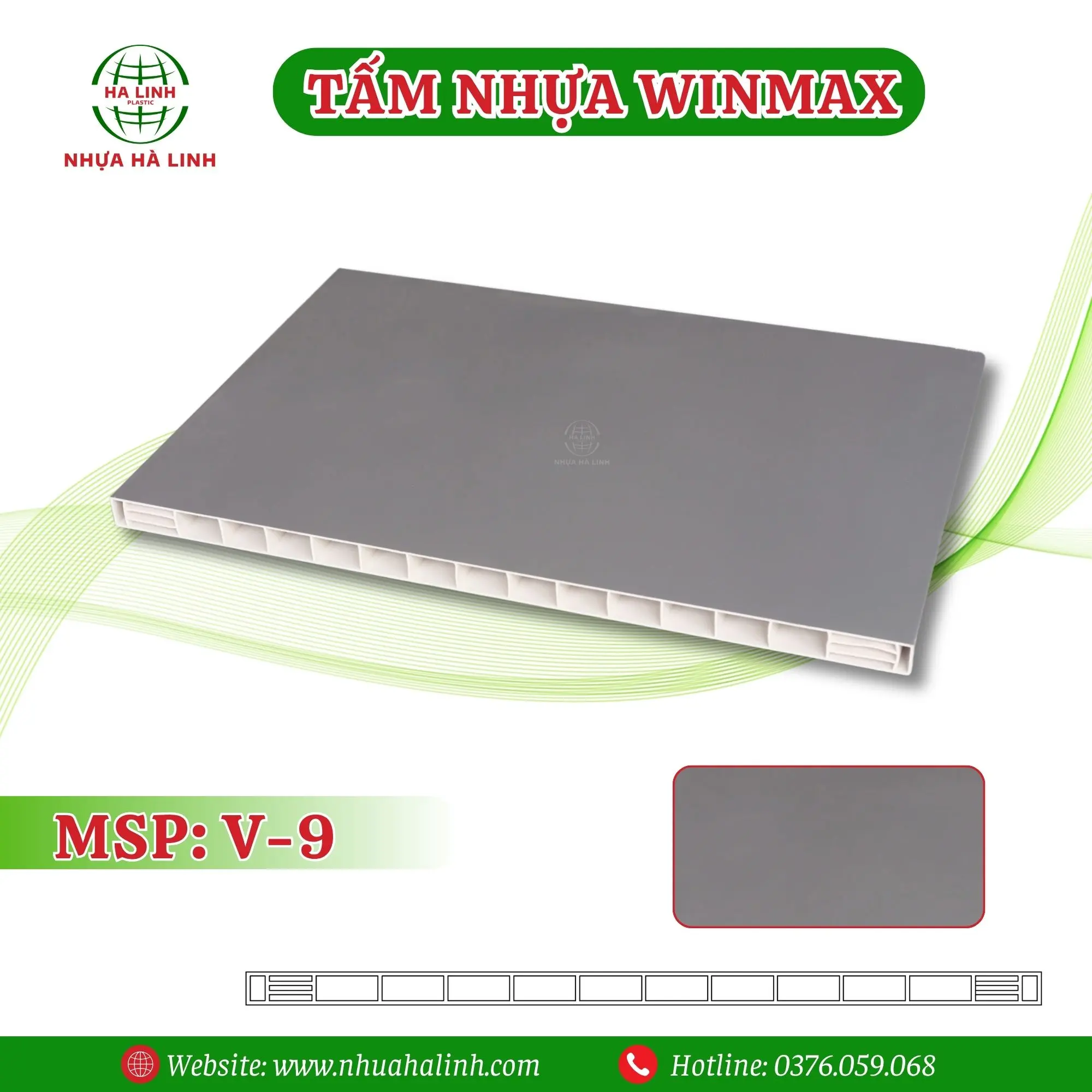 Tấm nhựa Winmax V-9 là sản phẩm cao cấp thuộc dòng nhựa Winmax của Nhựa Hà Linh, được sản xuất từ nhựa PVC nguyên sinh kết hợp công nghệ ép định hình hiện đại. Bề mặt sản phẩm là màu đơn sắc xám ghi đậm, tạo cảm giác sang trọng và hiện đại cho mọi không gian.