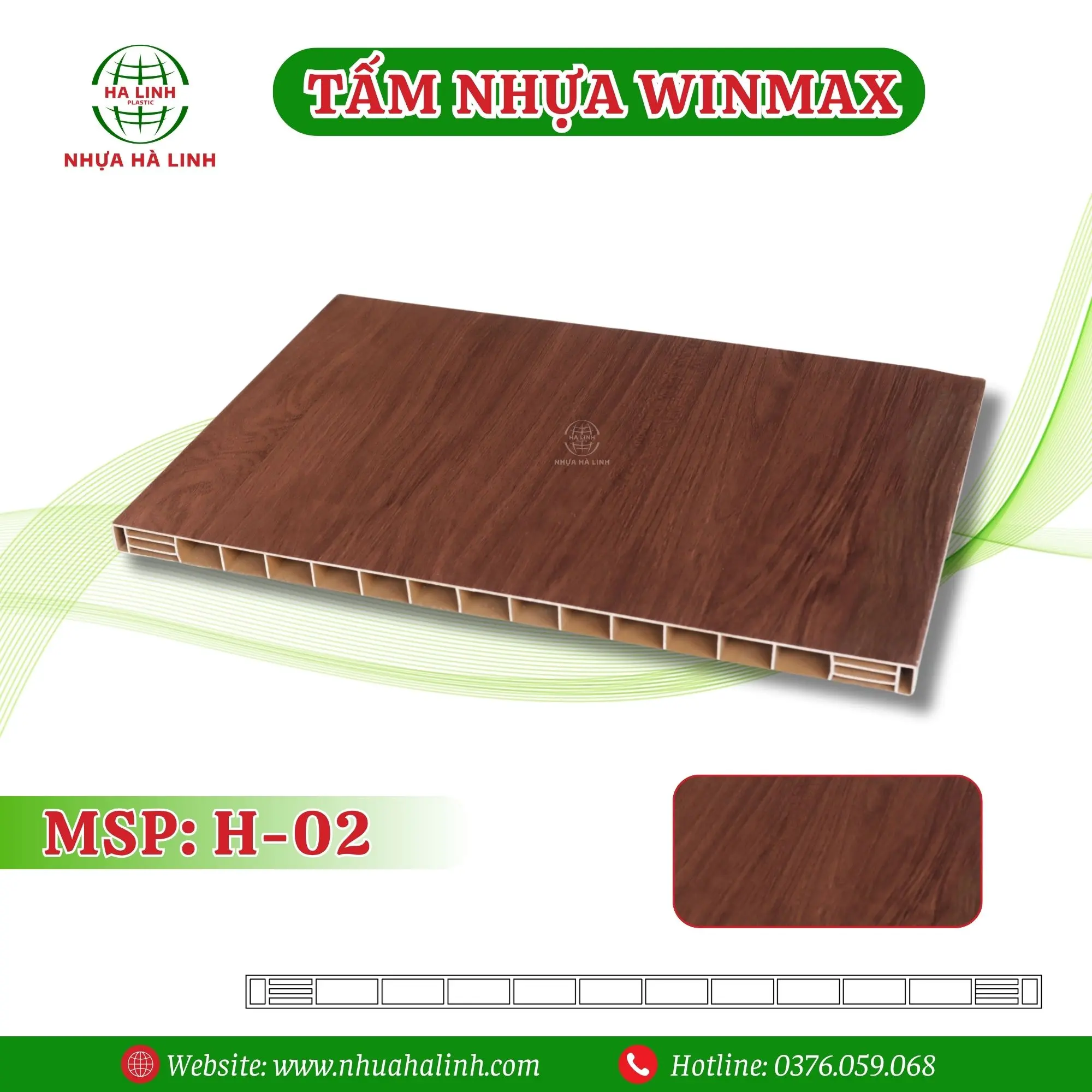 Tấm nhựa Winmax H-02 là sản phẩm cao cấp thuộc dòng nhựa Winmax của Nhựa Hà Linh, được sản xuất từ nhựa PVC nguyên sinh kết hợp công nghệ ép định hình hiện đại. Bề mặt sản phẩm mô phỏng tinh tế vân gỗ tự nhiên, tạo cảm giác ấm áp và sang trọng cho mọi không gian.