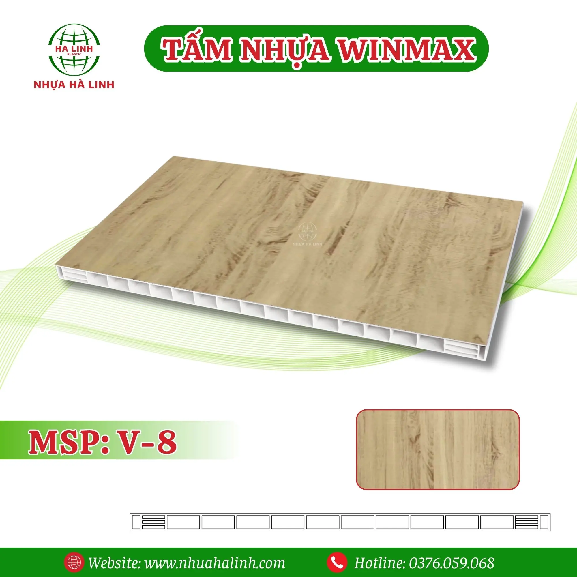 Tấm nhựa Winmax V – 8 là sản phẩm cao cấp thuộc dòng nhựa Winmax của Nhựa Hà Linh, được sản xuất từ nhựa PVC nguyên sinh kết hợp công nghệ ép định hình hiện đại. Bề mặt sản phẩm mô phỏng tinh tế vân gỗ tự nhiên, tạo cảm giác ấm áp và sang trọng cho mọi không gian.