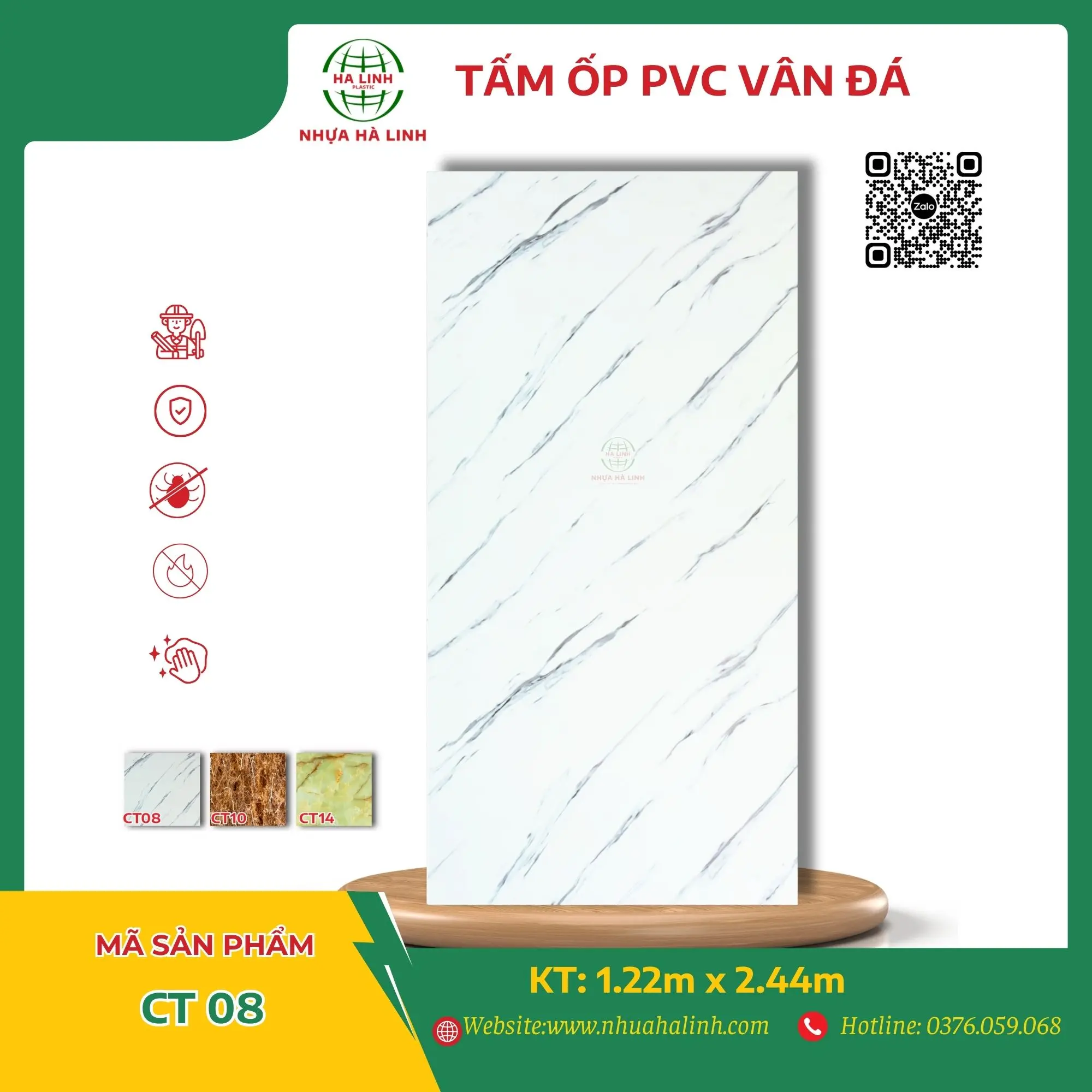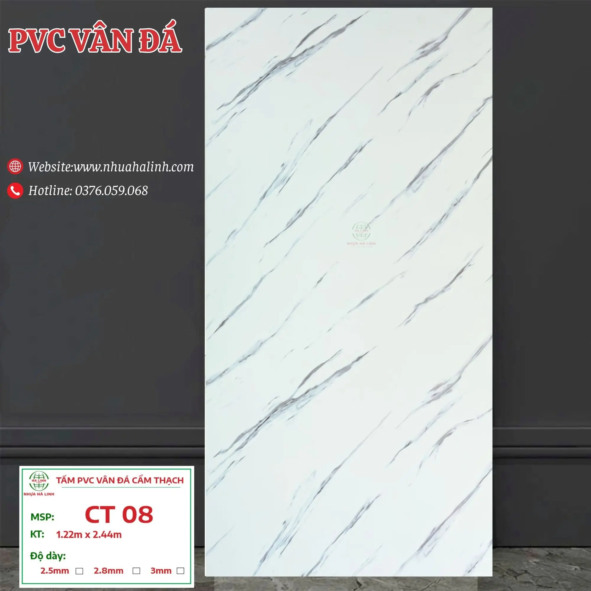 Để hiểu rõ hơn về từng sản phẩm tấm PVC Vân Đá của Công ty TNHH MTV Sản Xuất Và Thương Mại Nhựa Hà Linh và đặc biệt là sản phẩm PVC Vân Đá – CT 08. Quý khách hàng xin vui lòng liên hệ với Nhựa Hà Linh qua: