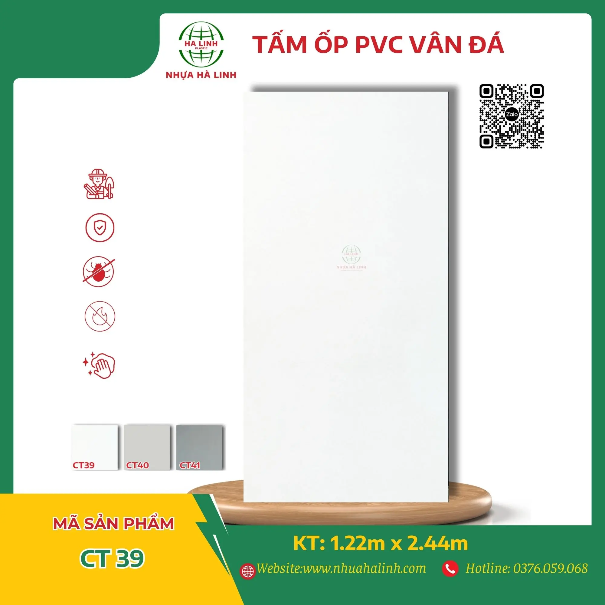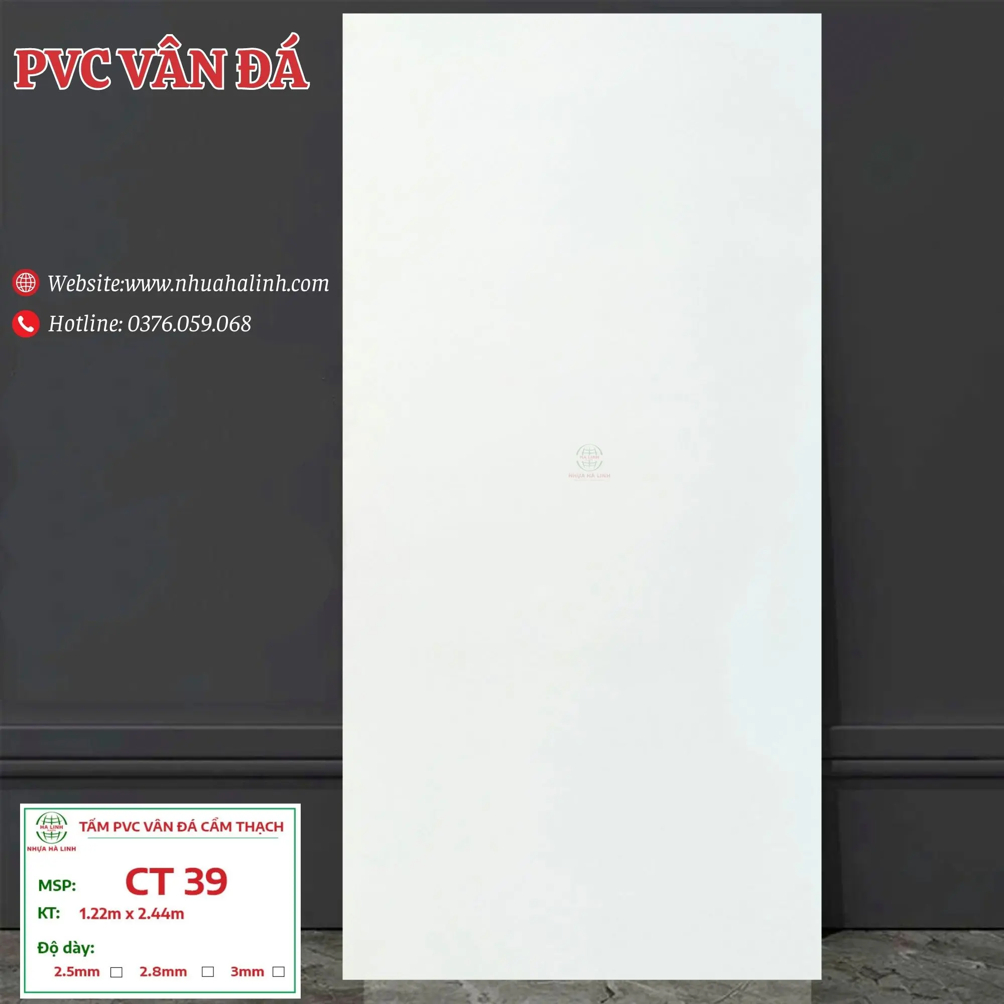 Để hiểu rõ hơn về từng sản phẩm tấm PVC Vân Đá của Công ty TNHH MTV Sản Xuất Và Thương Mại Nhựa Hà Linh và đặc biệt là sản phẩm PVC Vân Đá – CT 39. Quý khách hàng xin vui lòng liên hệ với Nhựa Hà Linh qua: