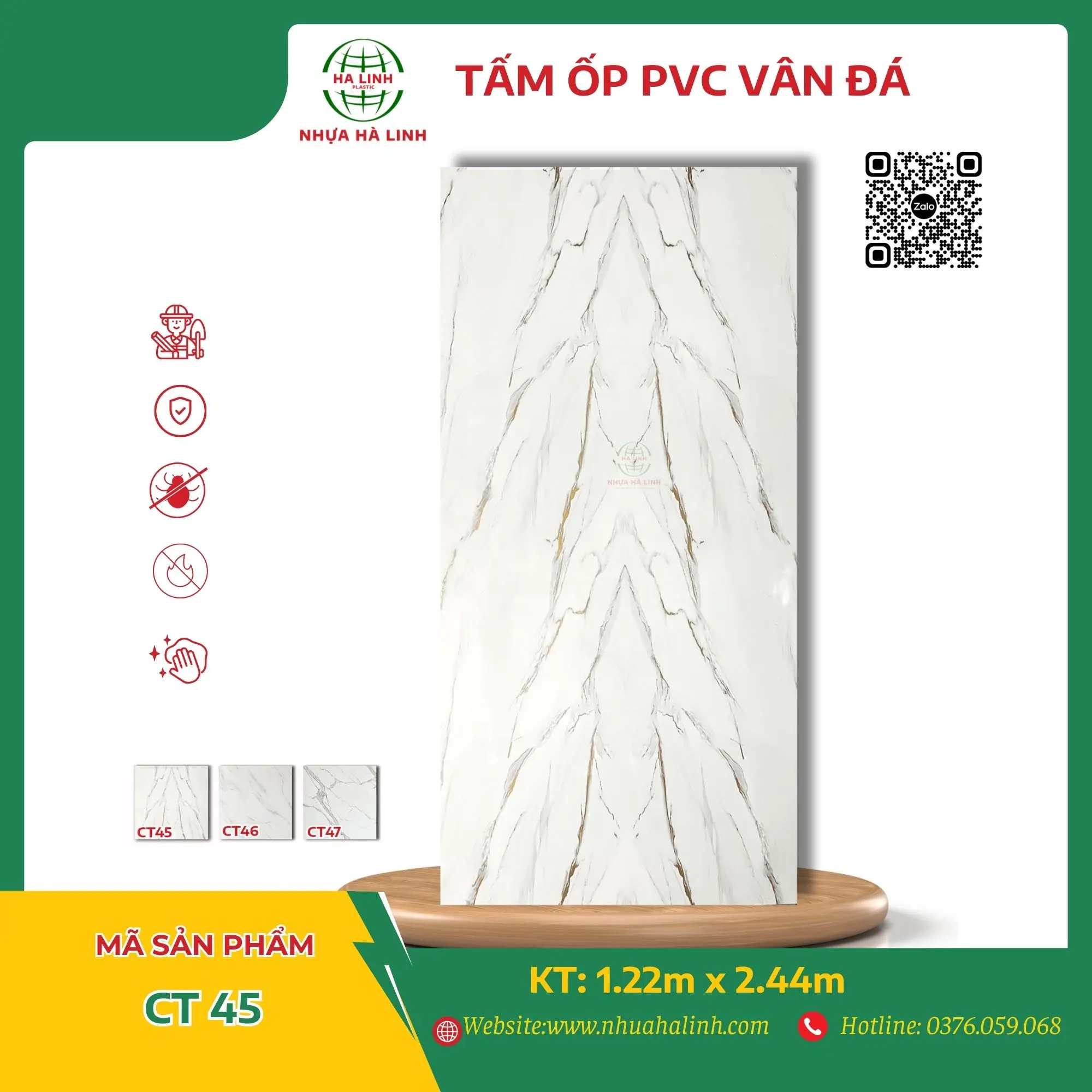 Để hiểu rõ hơn về từng sản phẩm tấm PVC Vân Đá của Công ty TNHH MTV Sản Xuất Và Thương Mại Nhựa Hà Linh và đặc biệt là sản phẩm PVC Vân Đá – CT 45. Quý khách hàng xin vui lòng liên hệ với Nhựa Hà Linh qua: