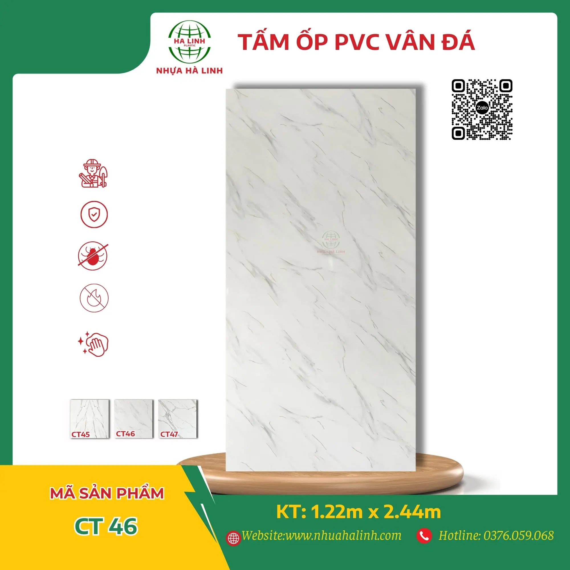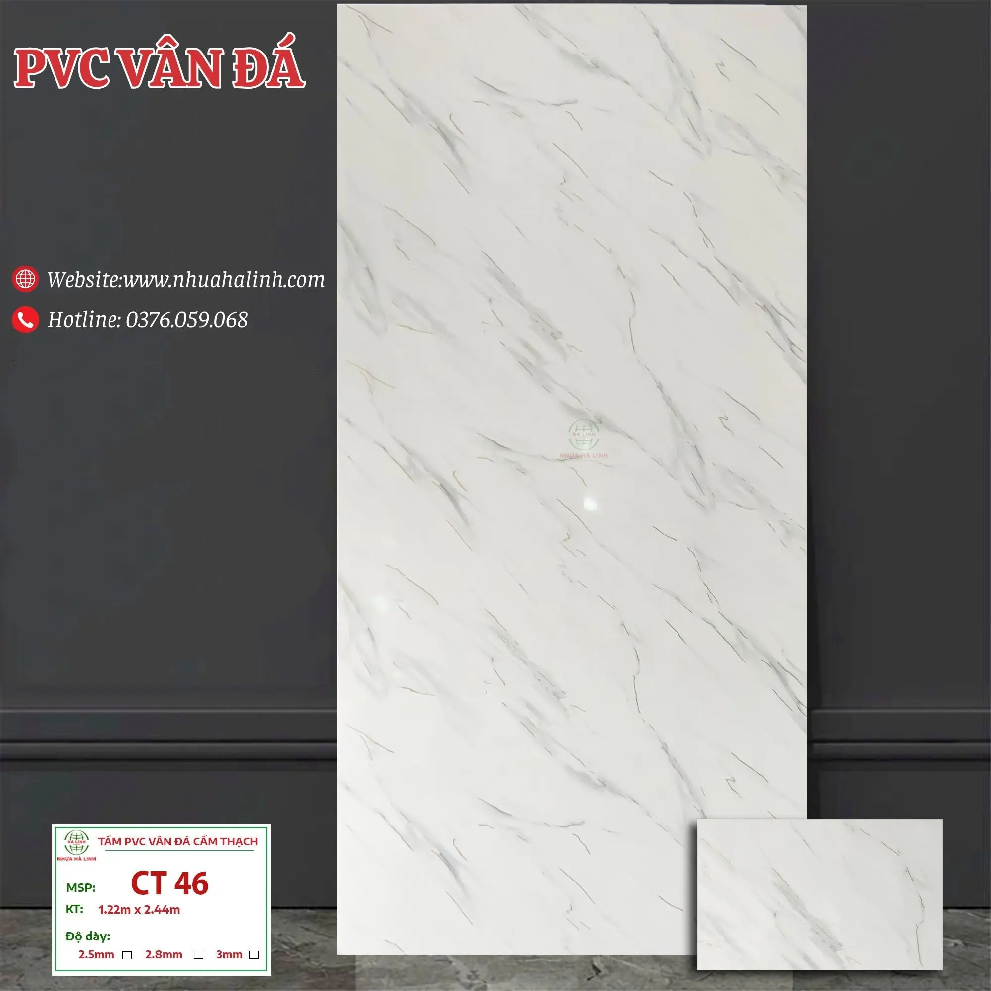 Để hiểu rõ hơn về từng sản phẩm tấm PVC Vân Đá của Công ty TNHH MTV Sản Xuất Và Thương Mại Nhựa Hà Linh và đặc biệt là sản phẩm PVC Vân Đá – CT 46. Quý khách hàng xin vui lòng liên hệ với Nhựa Hà Linh qua: