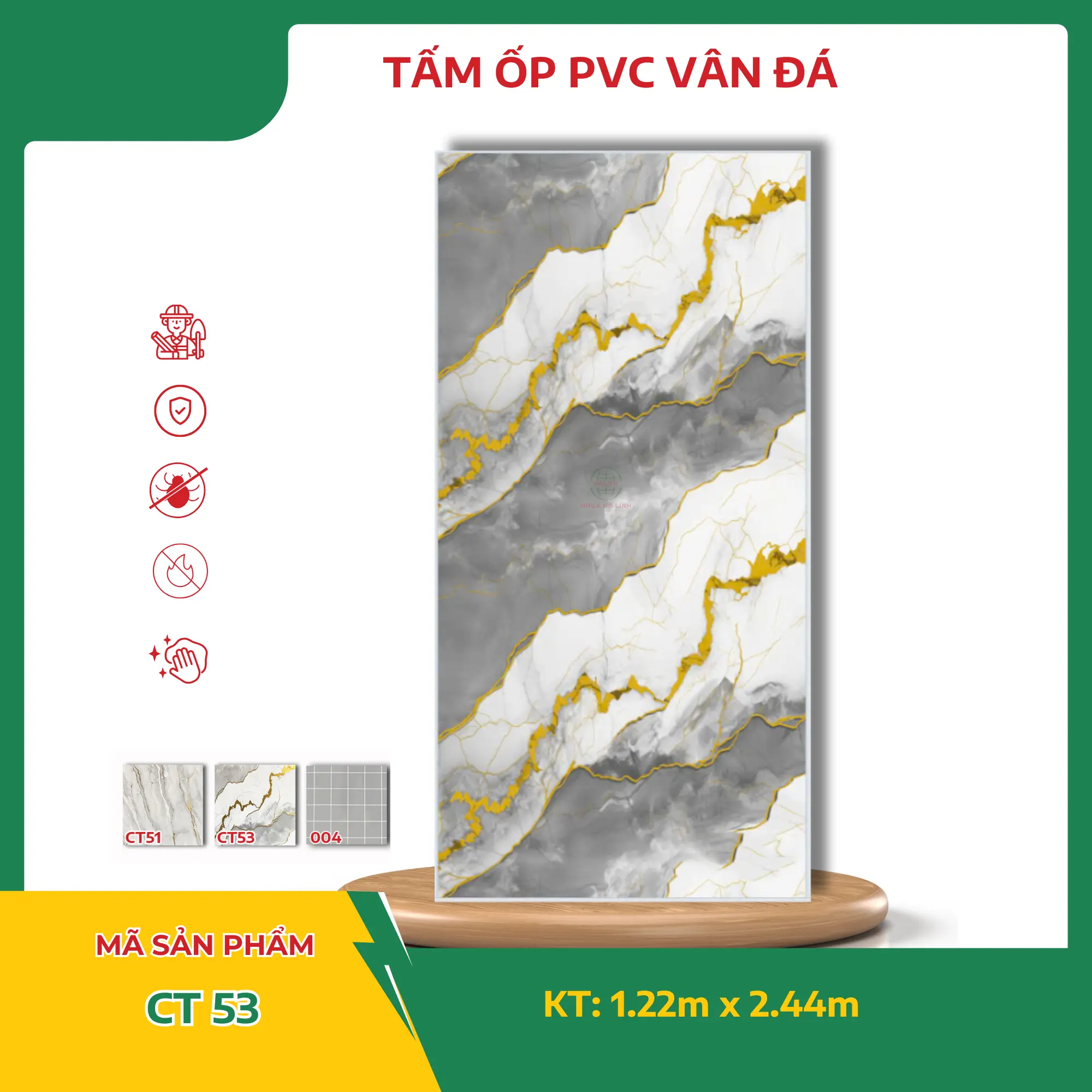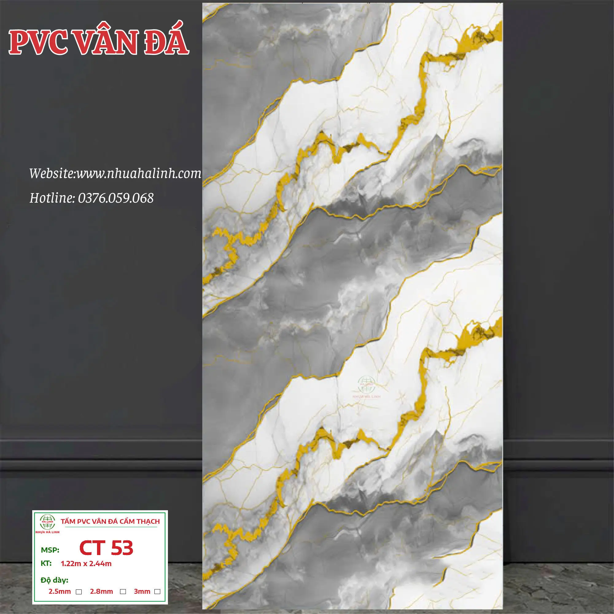 Để hiểu rõ hơn về từng sản phẩm tấm PVC Vân Đá của Công ty TNHH MTV Sản Xuất Và Thương Mại Nhựa Hà Linh và đặc biệt là sản phẩm PVC Vân Đá – CT 53. Quý khách hàng xin vui lòng liên hệ với Nhựa Hà Linh qua: