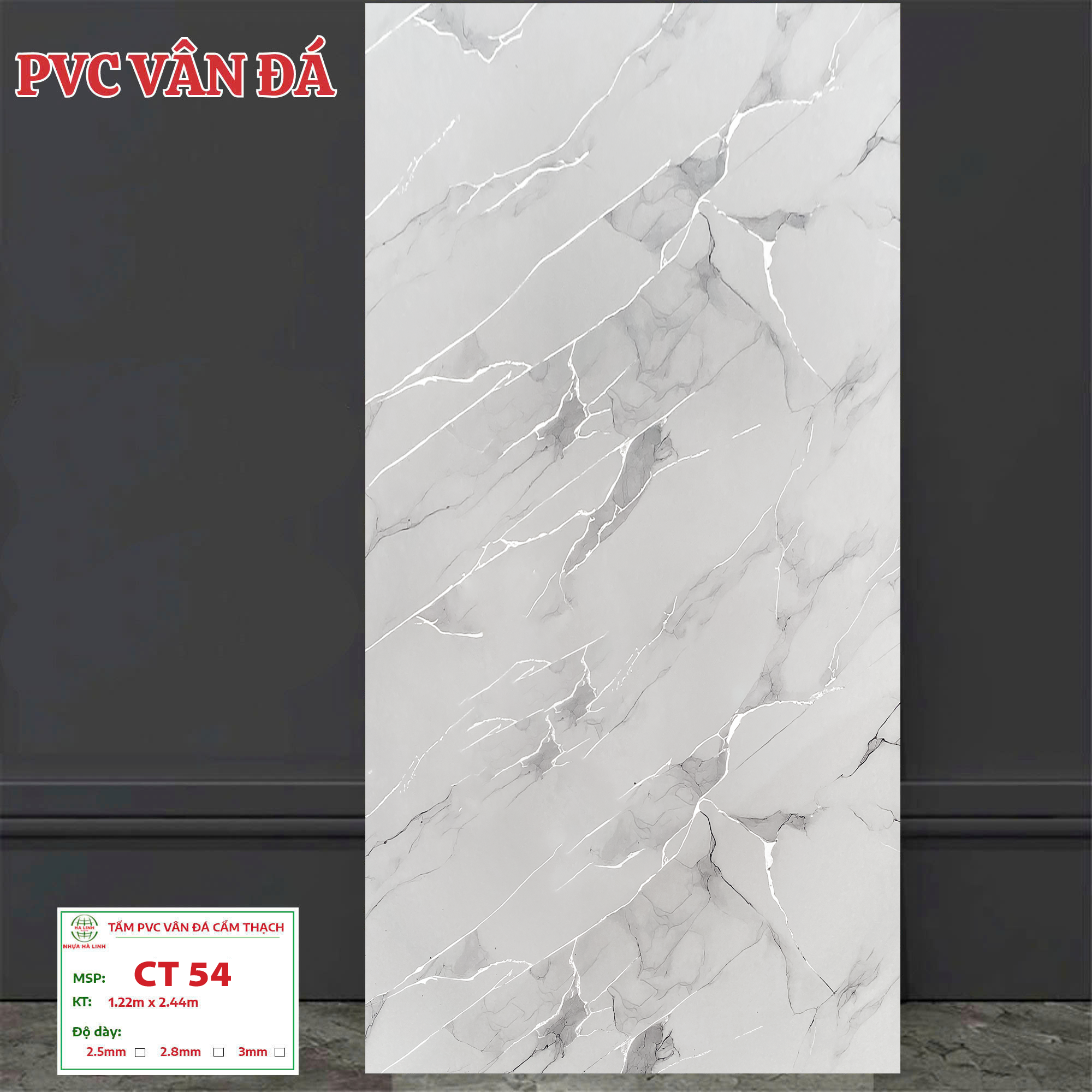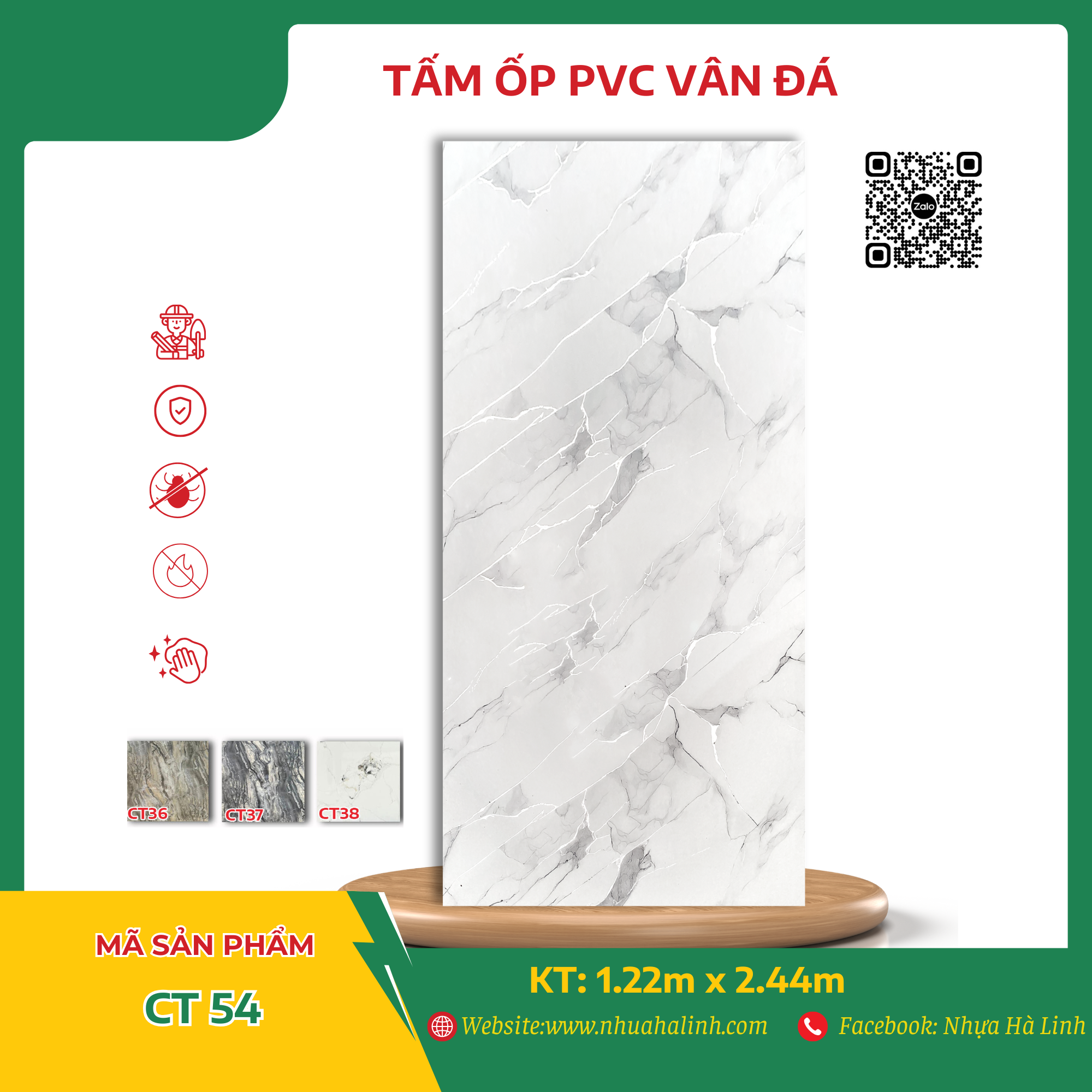 Để hiểu rõ hơn về từng sản phẩm tấm PVC Vân Đá của Công ty TNHH MTV Sản Xuất Và Thương Mại Nhựa Hà Linh và đặc biệt là sản phẩm PVC Vân Đá – CT 54. Quý khách hàng xin vui lòng liên hệ với Nhựa Hà Linh qua: